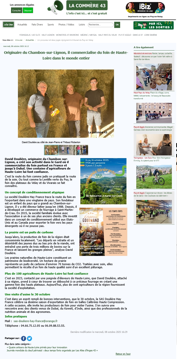La Commère 43 – Originaire du Chambon-sur-Lignon il commercialise du foin de Haute-Loire dans le monde entier